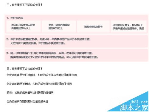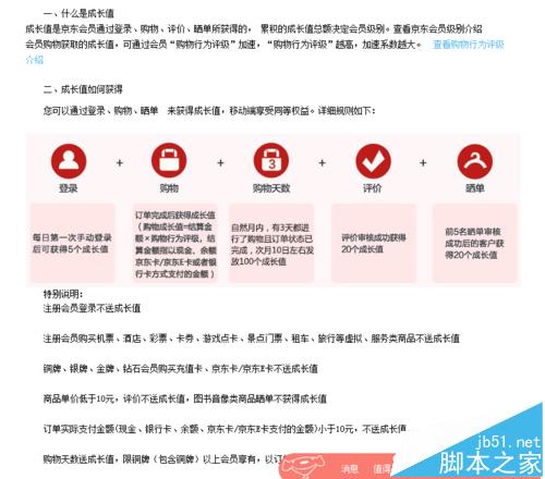 2、而要想獲得成長值,則需要通過登錄、購物、評價、曬單來獲取。具體的細則款項大家可以參照下圖的官方說明。