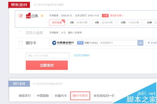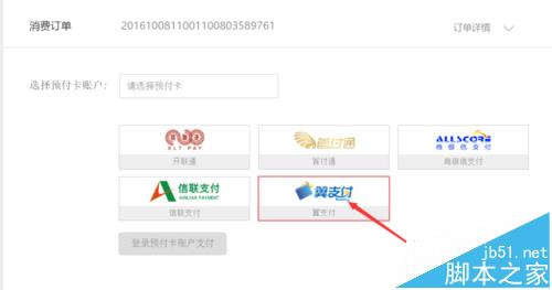 4、訂單提交成功之后,我們就會進入付款頁面,在付款頁面中,我們選擇頁面下方的“預付卡支付”方式。