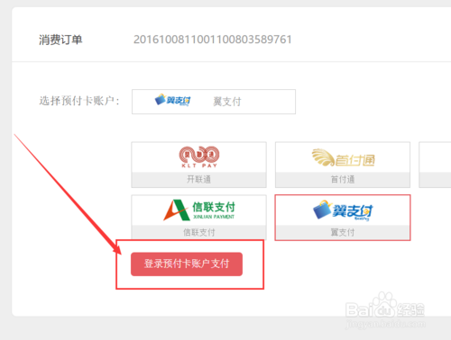 6、接下來,我們在彈出的頁面中選擇“登錄預付卡賬戶付款”按鈕,然后將跳轉到翼支付付款頁面。