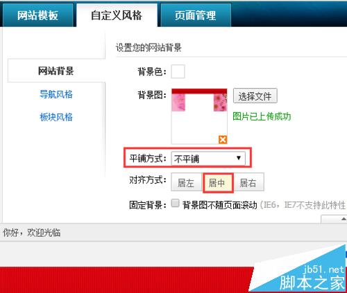 14、【自定義風(fēng)格】——【網(wǎng)站背景】背景圖【選擇文件】剛剛保存好的紅色背景圖片,對齊方式選擇【不平鋪】——【居中對齊】。