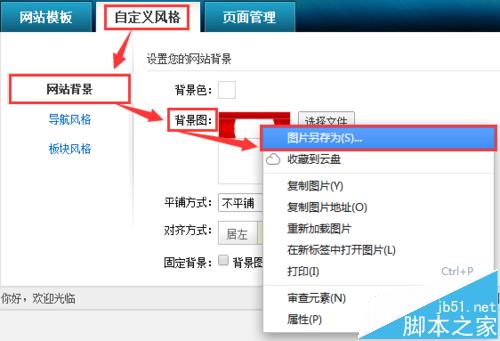 9、【自定義風(fēng)格】——【網(wǎng)站背景】右擊【紅色的背景圖片】,把背景圖片另存為到桌面上。