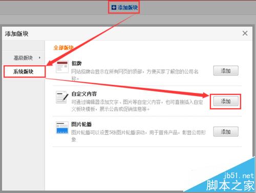 5、在首頁的中間位置上【添加板塊】——【系統(tǒng)板塊】選擇自定義內(nèi)容板塊,點擊【添加】。