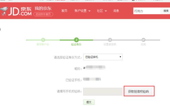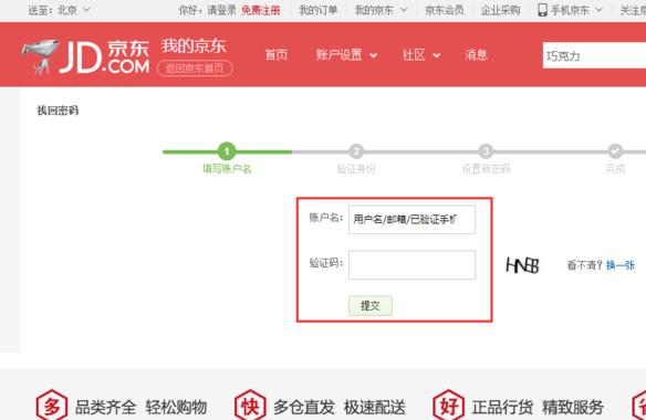 2、點擊【忘記密碼】選項,進入找回密碼界面,首先需要填寫賬戶名,需要正確填寫京東賬號及驗證碼,如下圖所示。