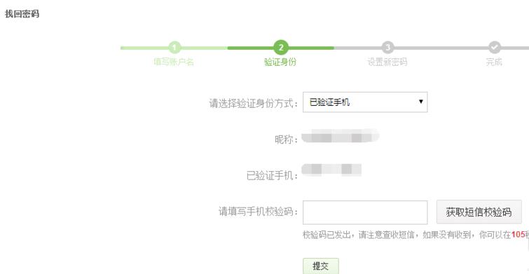 3、正確輸入賬號及驗證碼之后,點擊【提交】按鈕,進入驗證身份界面,如下圖所示。