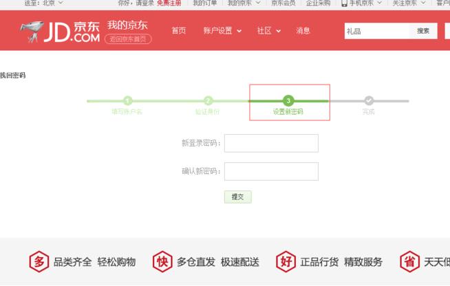 6、按要求正確輸入要重置的新密碼,點擊【提交】按鈕,此時可以重置京東的登錄密碼,以后使用新密碼登錄京東即可,如下圖所示。