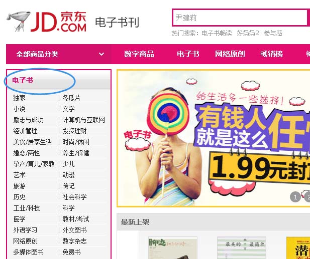 1、首先,打開京東首頁,登陸自己的賬號。在“全部分類”目錄中選擇“電子書”,如下圖所示