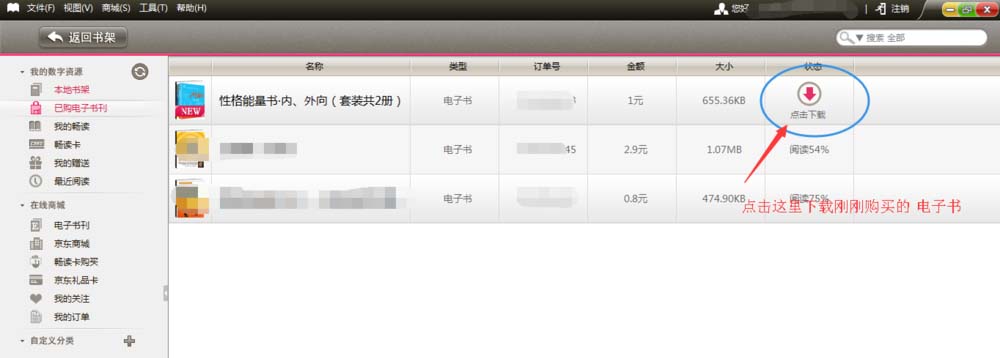 6、在這個lebook客戶端(即京東讀書客戶端)上登陸你的京東賬號,點擊面板左側的“已購電子書刊”,下載你剛剛購買的電子書,如上圖所示。下載完成后,打開電子書即可閱讀,如下圖所示