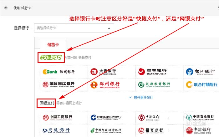 5、接著,選擇銀行卡。在此需要注意的是,有些銀行卡支持的支付方式是快捷支付,有些支持的是網銀支付,請確保你選擇的銀行卡事先已經開通了相應的支付功能。