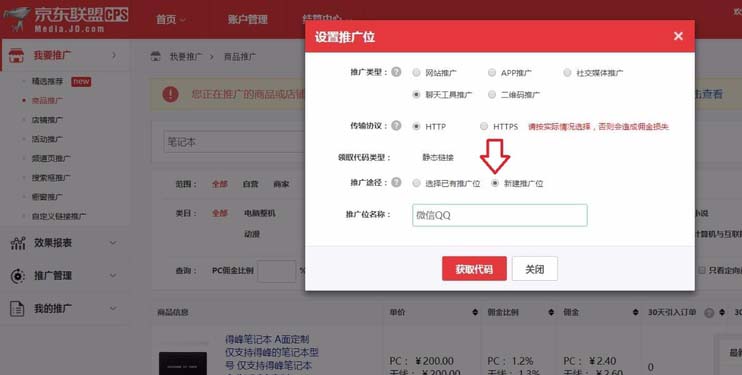 3、在彈出的小窗口中,根據實際情況進行設置后,點擊選擇箭頭所示“新建推廣位”并設置名稱。