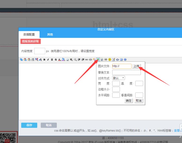 5、點擊置入自定義內容,選擇設置,切記是下邊藍色的那個設置 。點擊上傳做好的海報海報最好,寬1920 長614
