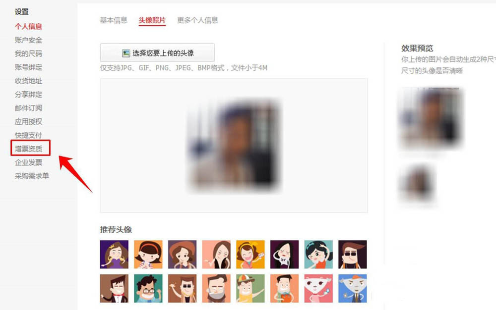 4、點擊“增票資質”。進入個人信息設置頁面后,在左側的設置欄目中選擇【增票資質】選項卡,并點擊。