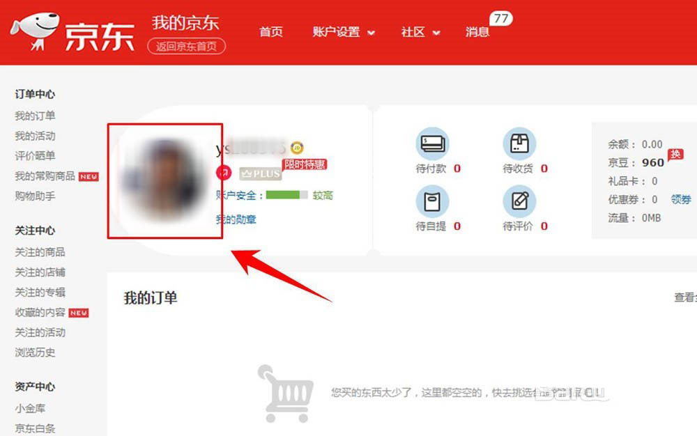 3、進入“我的京東”。進入“我的京東”頁面后點后繼續(xù)點擊自己的頭像或是賬戶名,如圖所示位置。