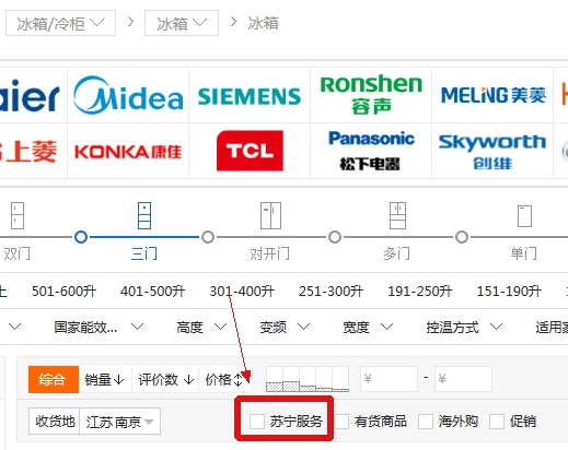 2、進入搜索結果頁,在篩選條件處,點擊勾選“蘇寧服務”。