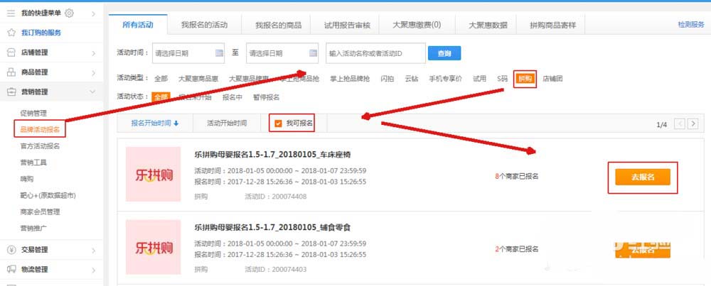 1、在商家后臺找到營銷活動的對應活動報名入口,點擊去報名