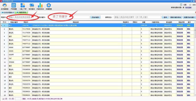 4、錄入商品ID或者商品鏈接和關(guān)鍵字查詢,在輸入框內(nèi)錄入商品ID和關(guān)鍵字,;錄入之后點(diǎn)擊添加按鈕