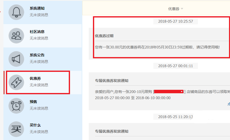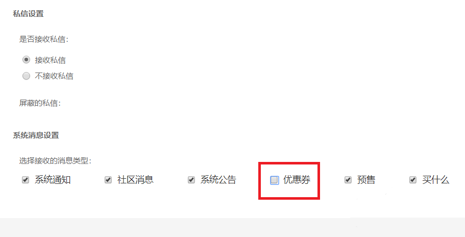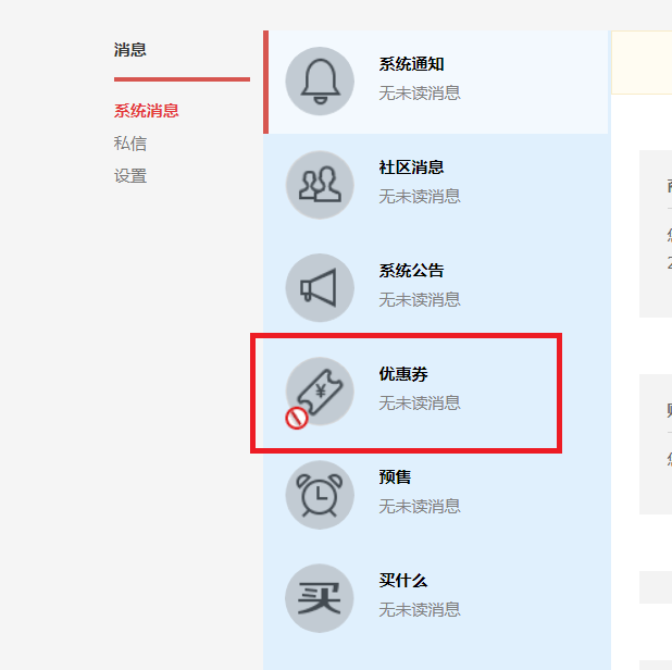 6、我們把優惠券前面的勾選取消,然后回到剛才的消息頁面,這個時候可以看到優惠券那一行上面已經被打上了禁止標識。說明配置成功,至此,后面都不會給你發各種優惠券過期提示了。