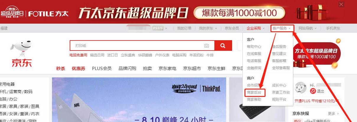 4、在頂部,找到“客戶服務(wù)”,下拉“客戶服務(wù)”的復(fù)選框,選擇“商家后臺”