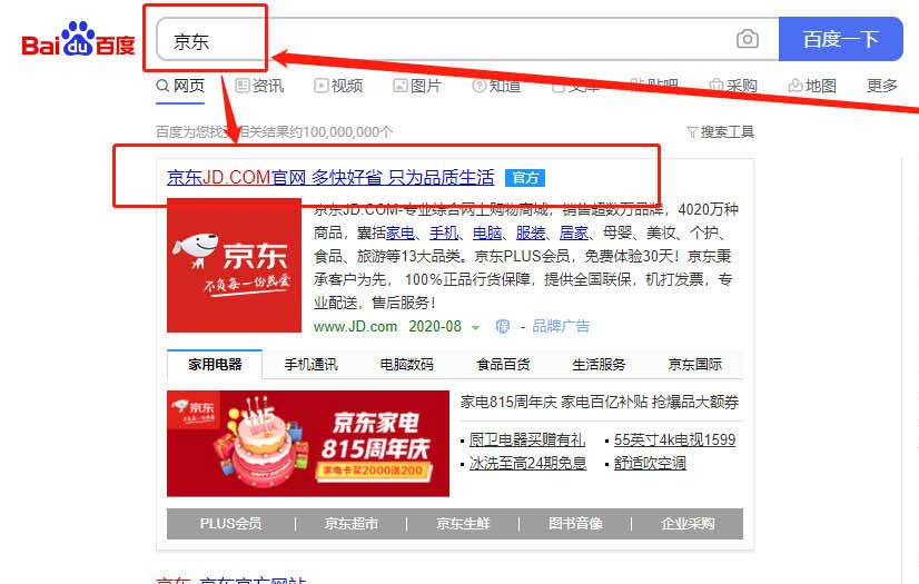 2、直接搜索“京東”即可,點(diǎn)擊進(jìn)入京東的官網(wǎng)