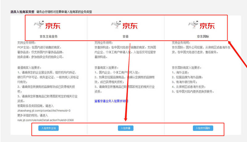 6、跳轉(zhuǎn)到入駐頁面,這邊根據(jù)自己需求選擇京東主站(也就是平時(shí)大家用的)、京喜或者是京東國際;之后填寫一些信息,即可入駐了
