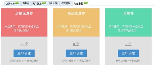 無線端優惠券在賣家中心的聯合營銷中:分為店鋪優惠券和商品優惠券以及包郵券三種。