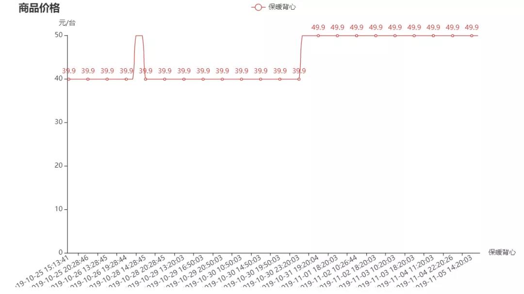 這款保暖背心產(chǎn)品,之前標(biāo)價(jià) 39.9元,到11月之后卻突然調(diào)價(jià)為 49.9元,并標(biāo)注上了“雙11狂歡價(jià)”,也就是原價(jià)……