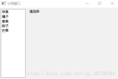 SplitVertically(window1, window2, sashPosition=0)。設置左右布局的分隔窗口,window1為左窗口,window2為右窗口,sashPosition是窗口的位置。 SplitHorizontally(window1, window2, sashPosition=0)。設置上下布局的分隔窗口,window1為上窗口,window2為下窗口,sashPosition是窗口的位置。 SetMinimumPaneSize(paneSize)。設置最小窗口尺寸,如果是左右布局是指左窗口的最小尺寸,如果是上下布局是指上窗口的最小尺寸。如果沒有設置則默認為0。如下圖為一個分割窗口,采用的是左右分割,左右兩邊各放一個面板。左邊面板設置一個垂直box管理器,并添加上一個ListBox控件;然后給控件綁上事件處理,獲取事件內容并在右側的StaticText上顯示出來。