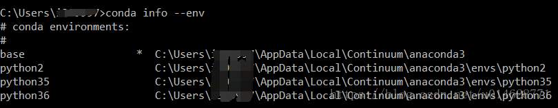 conda info --env可以看到所有python環境,前面有個‘*'的代表當前環境: