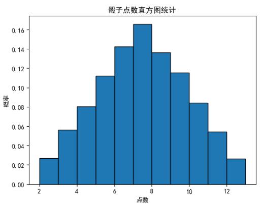 plt.hist(roll_list, bins=range(2,14),normed=1,edgecolor='black',linewidth=1) #normed是歸一化,求頻率。設置邊界顏色及寬度plt.title('骰子點數直方圖統計')plt.xlabel('點數')plt.ylabel('概率')plt.show()