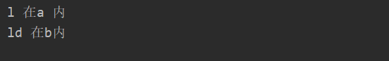 # 單個字符a='hello'b='world'if ('l' in a): print('l 在a 內')else: print('l 不在 a 內')# 連續多個字符if ('ld' in b): print('ld 在b內')else: print('ld不在b內')