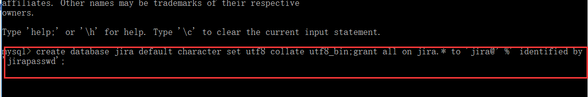 "create database jira default character set utf8 collate utf8_bin;grant all on jira.* to 'jira@'%' identified by 'jirapasswd';"