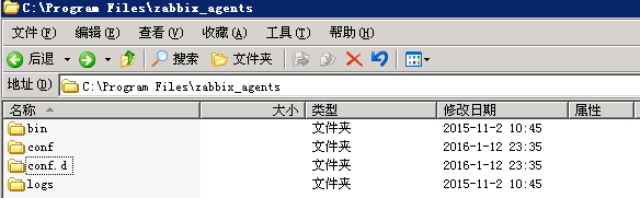 將下載的文件解壓至 C:/Program Files/zabbix_agents 目錄中,并創(chuàng)建conf.d,logs目錄,如下圖所示