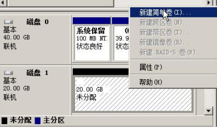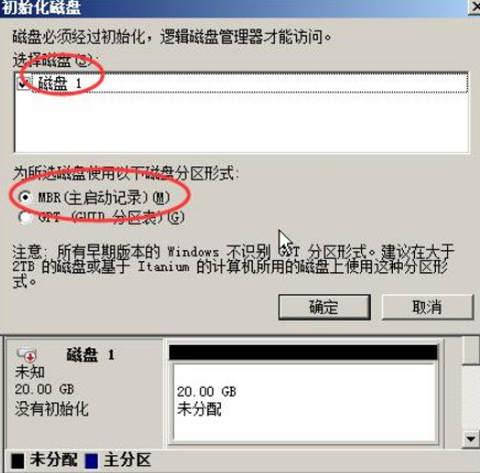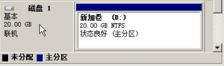 在Windows Server 2008 R2 64位操作系統上格式化并分區一塊20GB的數據盤,具體操作如下: