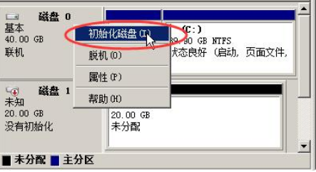 3、 再右鍵點擊磁盤1,在彈出菜單中點擊初始化磁盤,在初始化磁盤對話框里,選擇磁盤1,并選擇磁盤分區形式,如圖所示選擇MBR分區。
