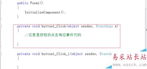 8、雙擊某個(gè)控件,就會(huì)跳到對(duì)應(yīng)的代碼編輯頁(yè)面,進(jìn)行相對(duì)應(yīng)的操作響應(yīng)事件代碼的編寫。比如,雙擊按鈕,就會(huì)跳到代碼編寫頁(yè)面,進(jìn)行按鈕點(diǎn)擊響應(yīng)事件代碼的編寫。這里可以編寫各種各樣的事件。