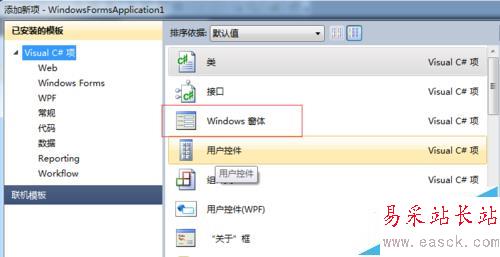 4、在彈出的對(duì)話框中,在左側(cè)的已安裝的模板中選擇Visual C#,然后在右側(cè)列出的選項(xiàng)中選擇Windows窗體,這里第三項(xiàng)就是。然后點(diǎn)擊添加按鈕即可增加新的窗體。可以在文本框中改變窗體的名稱。