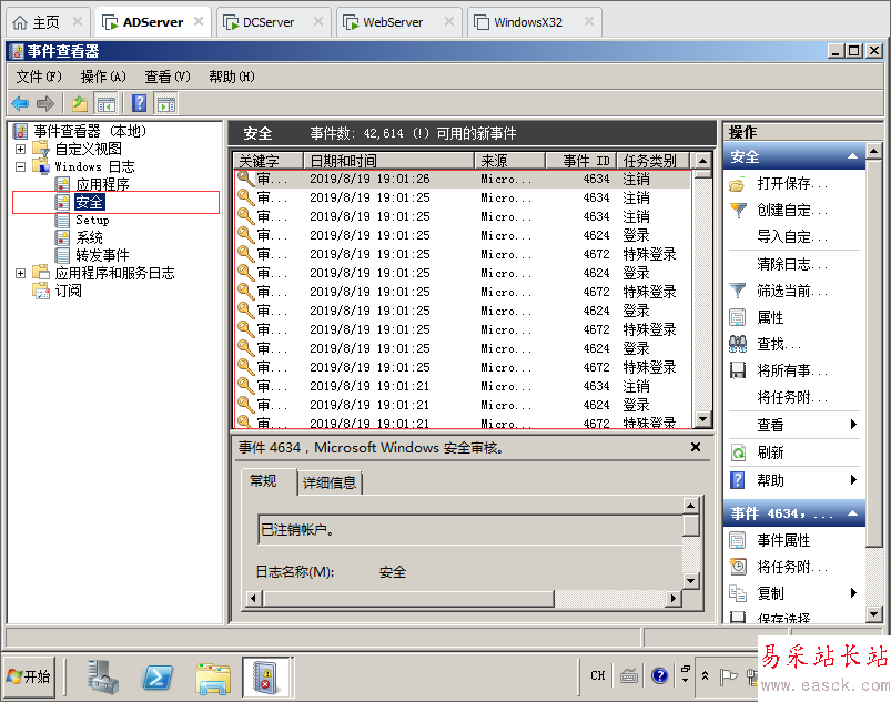 2.打開事件管理器點擊Windows日志,選擇安全可以查看,賬號審核情況,什么時候登錄過系統(tǒng)什么時候注銷都有記錄。