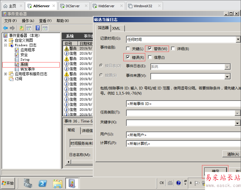 4.可以右鍵選擇系統(tǒng)篩選日志,只顯示警告跟錯誤信息。