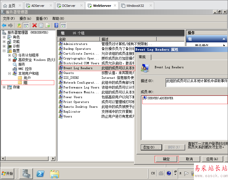 8.打開DCServer服務(wù)器上面的 服務(wù)器管理器找到本地用戶和組然后把ADServer服務(wù)器加入到Event Log Readers日志組里面,點擊添加選擇對象全部勾選計算機,然后輸入對象名稱輸入ADServer然后確定。