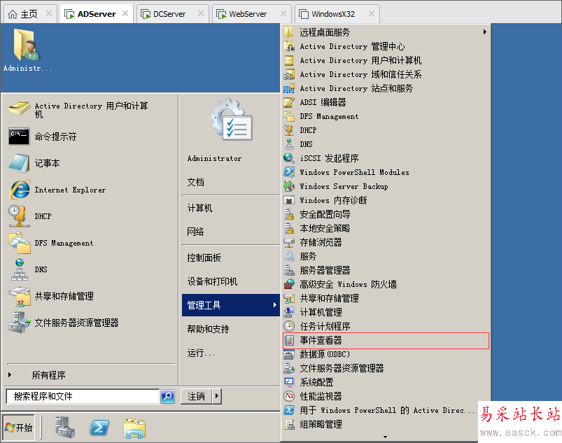 1.在ADServer服務(wù)器上面點擊開始菜單,選擇管理工具,打開事件查看器。
