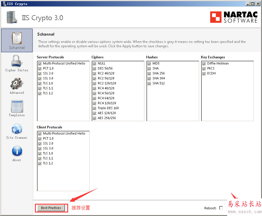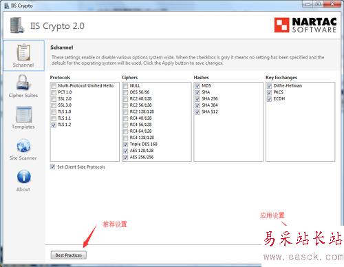 對于Windows Server服務器來說,通過修改注冊表可以完成SSL安全配置,此外,還有一個簡單的自動配置工具IISCrypto,下載該工具后,使用推薦配置即可完成安全設置,使用起來非常簡單。
