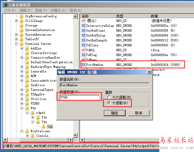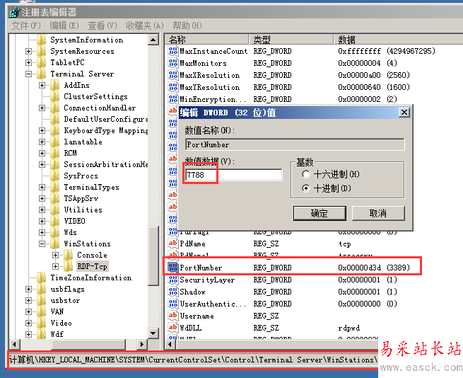 找到下面的 "PortNumber",用十進制方式顯示,默認為3389,改為任意可用端口。演示:(7788)