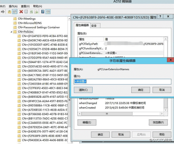 解決的方案就是在ADSIEDIT中將這條組策略中的gPCUserExtensionNames的值清除掉。