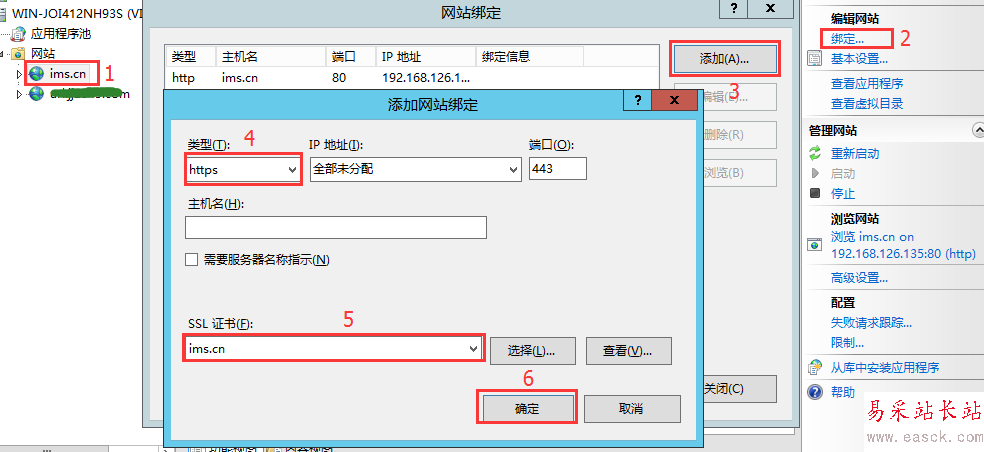 在IIS 8上將兩張證書,分別綁定在兩個不同的網站的默認https端口443上。