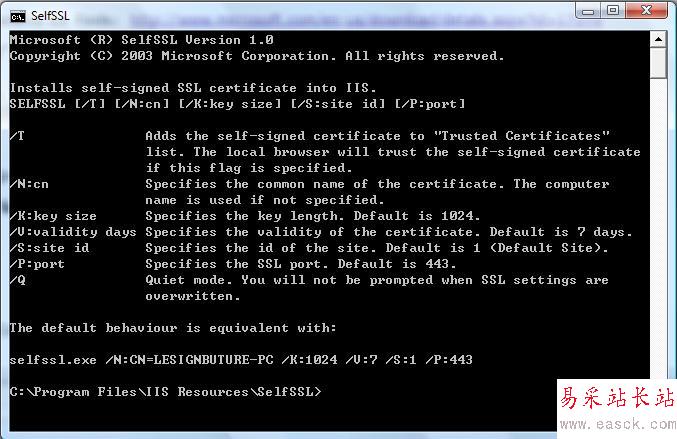 安裝好之后,點擊“開始”-“所有程序”-“IIS Resources”-“SelfSSL”,打開SelfSSL,界面如下: