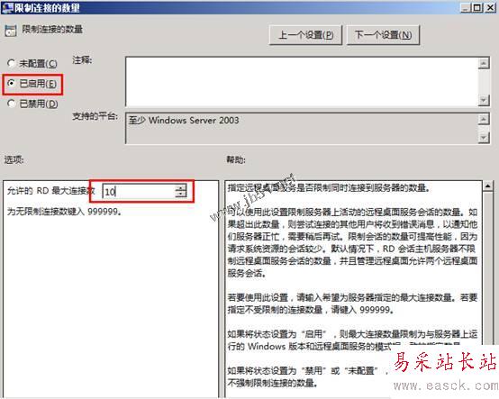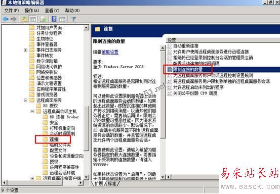 4、 在運(yùn)行中運(yùn)行g(shù)pedit.msc,在組策略中對(duì)位于“計(jì)算機(jī)配置/策略/管理模板/Windows 組件/遠(yuǎn)程桌面服務(wù)/遠(yuǎn)程桌面會(huì)話主機(jī)/連接”中,限制連接數(shù)量中進(jìn)行配置;