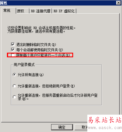 2、 在遠(yuǎn)程桌面會(huì)話主機(jī)配置中將“限制每個(gè)用戶只能進(jìn)行一個(gè)會(huì)話”的勾去掉。