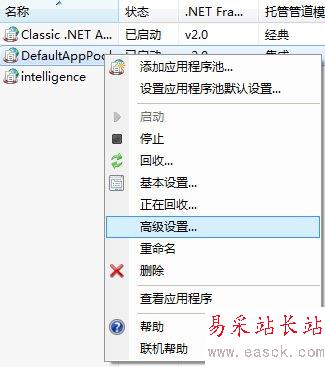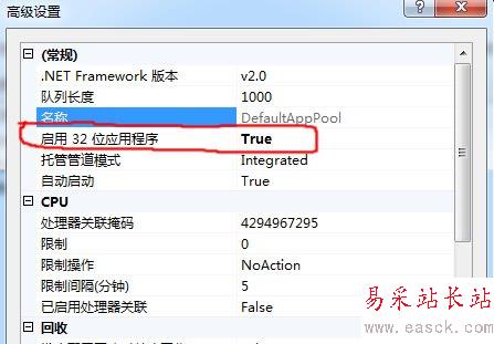 打開IIS管理器,點擊左邊的“應(yīng)用程序池”,在視圖中右鍵DefaultAppPool或你網(wǎng)站的獨立應(yīng)用程序池名字,選擇高級設(shè)置,修改如下圖: