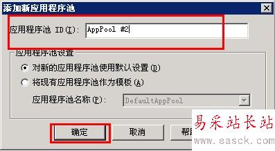2. [Apppool #2]是程序池名稱可以自己更改,每個程序池的設置可以選擇默認,或者將現有的一個池作為模版,然后點擊確定。如下圖