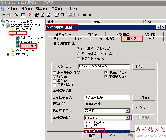 2. 在[網站]里邊找到[fdfdfd]這個網站,右鍵屬性--主目錄--應用程序池--Apppool #1(你要轉移到目的程序池)--點擊[應用]--確定。如下圖