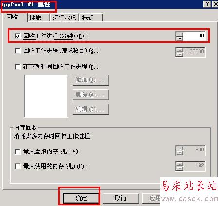 3. 右鍵[Apppool #1] 屬性--[回收工作進程]設置一最好是大于等于90分鐘。如下圖